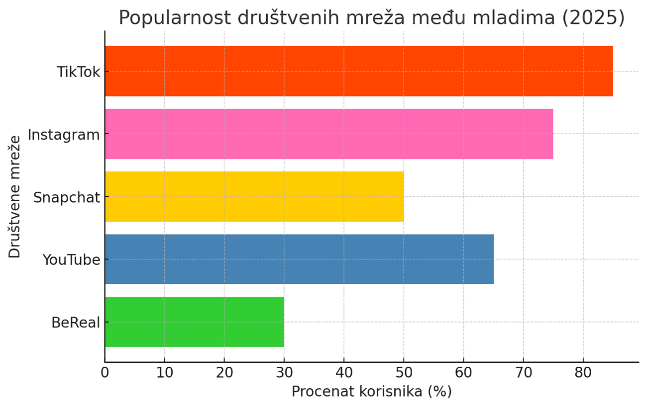 Prema aktuelnim istraživanjima, mladi u 2025. godini najviše koriste sledeće platforme: